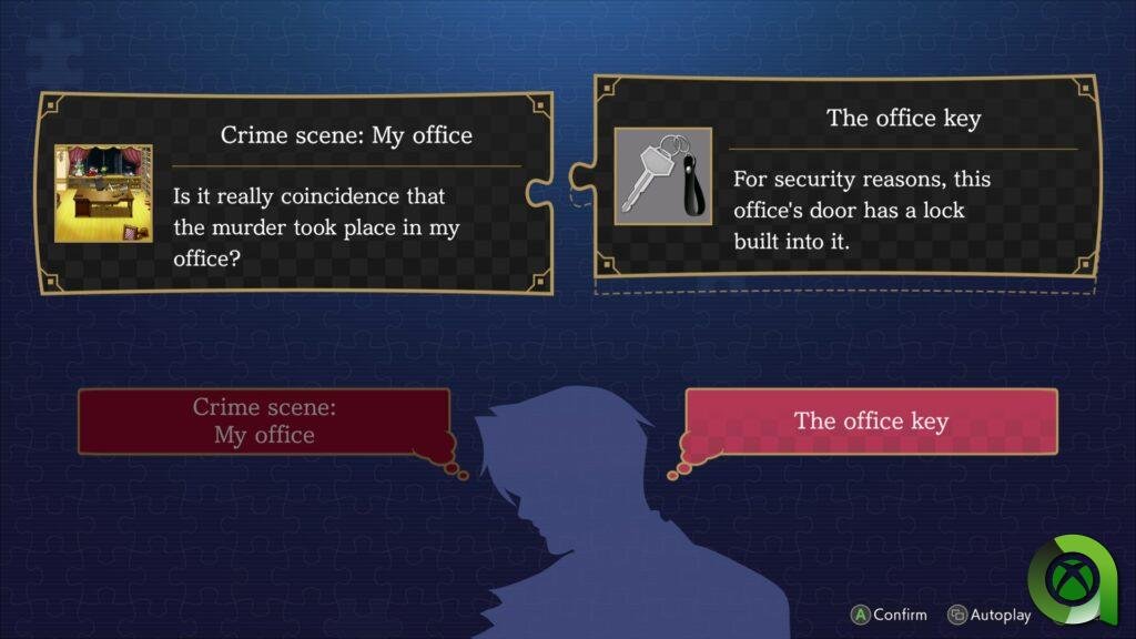 Los puzles que debemos resolver en ambos Ace Attorney Investigations se basan, cómo no, en investigar. Revisar cada elemento destacable (e incluso irrelevante, con el fin de añadir algo de humor a la aventura), inspeccionar modelos 3D de piezas relacionadas con el crimen… Aunque no hablamos de una mecánica muy compleja, sí que debe hacerse manualmente buscando en una escena los puntos concretos que creemos interesantes para mirar detenidamente. Las pistas relevantes van guardándose en nuestro organizador, donde estarán a buen recaudo hasta que las necesitemos. En adición, la deducción, consistente en avistar algo inusual que no parece encajar del todo en un entorno u objeto, añade un elemento más que nos obligará a estar bien atentos. Para ello, a veces tendremos que presentar una prueba guardada en el anteriormente mencionado organizador que nos sirva para dar explicación a eso inusual que hemos encontrado.