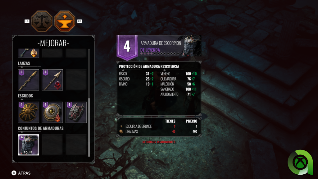 Al igual que nuestro personaje, las armas, escudos y armaduras pueden ser mejorados. Para mejorarlos deberemos de desbloquear al herrero. Este personaje se desbloquea siguiendo la historia principal. Una vez que lo tengamos a nuestra disposición, a cambio de unos dracmas y ciertos objetos, podremos ir subiendo de nivel nuestra equipación. Deberemos de tener clara nuestra elección, porque hay algunos objetos que son difíciles de encontrar o muy caros. En este sentido juega un papel importante la estrategia y decisión del jugador sobre la evolución del personaje y su jugabilidad.