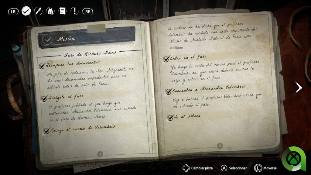 Contaremos con un diario en el que se organiza toda la información y documentación. Además, en él se los mostrarán las distintas investigaciones. Estas pueden ubicarse en el escenario en el que nos encontramos de manera íntegra, o bien encontrarse repartida por toda la aventura y para ello deberemos encontrar un determinado objeto en cada uno de los escenarios.