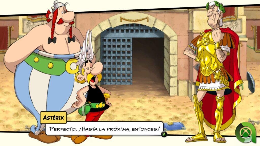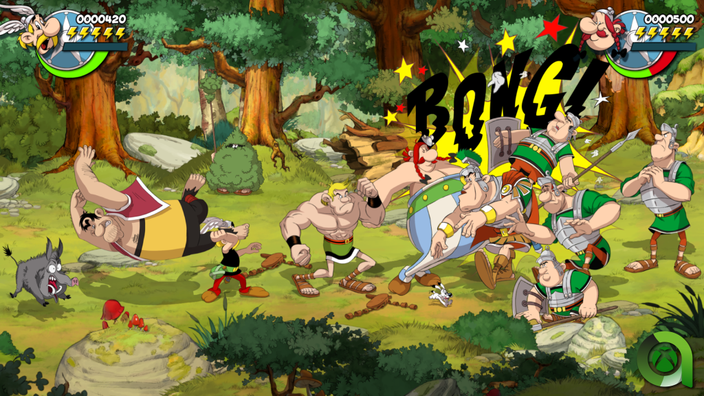 Los controles son bastante facilitos, tenemos un botón del ataque principal (X), botón de salto (A), puñetazo o habilidad pesada (Y) que realizará diferente movimiento dependiendo del acompañamiento que le des con la cruceta, agarrar enemigos u objetos (B) que depende con que personaje realicemos la acción hará una cosa un otra, bloquear (gatillo RB), y cambio de personaje entre Astérix y Obélix si lo estas jugando solo (LB).