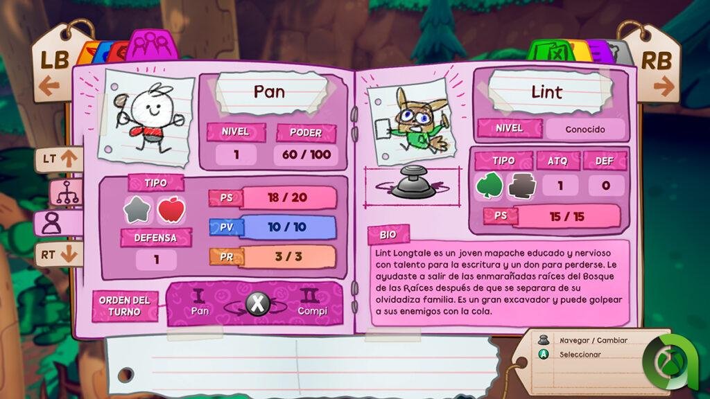 Born of Bread entra por los ojos, eso es evidente. Tiene un estilo artístico único, con personajes en 2D en entornos en 3D. Entornos que, por cierto, se modifican cuando conseguimos habilidades o avanza la historia. El tema es que todos los personajes, desde Pan a Número Uno, la mejor heroína del Gremio de Cronistas, tienen una gran personalidad y son muy expresivos. Además, los paisajes son, sencillamente, muy bonitos. Pero la personalidad no se queda ahí, pues los menús, como son creados por Pan y luego con ayuda de Lint, simularán dibujos a mano de un niño. Incluso los perfiles de los enemigos.
