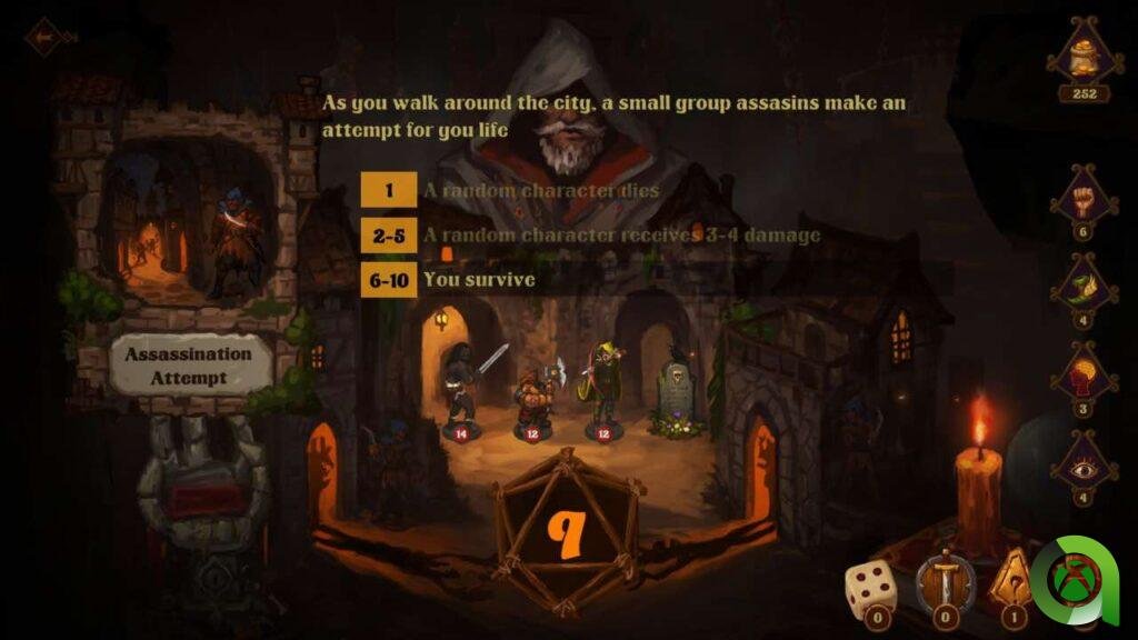 Como ya he adelantado, Dark Quest mezcla varios géneros. En primer lugar, es un roguelite en el que en cada «run» intentaremos progresar más para desbloquear personajes y otros extras. Todo escenario tiene su baraja de cartas, que hace las veces de «master» o «director de juego», desvelando las cartas estas nos pondrán en un contexto que muchas veces podremos resolver de varias maneras. Eso sí, dependiendo de si tenemos buena mano al lanzar el dado.