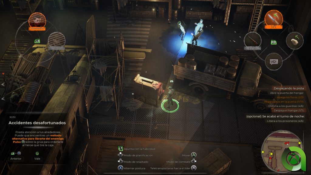 Por ello, es imprescindible utilizar todas las herramientas que nos propone este título para poder finalizar correctamente cada fase. Aparte de estas habilidades como lanzar una piedra, atacar por la espalda, realizar un ruido que alerte al enemigo… tendremos otras acciones como arrastrarse por el suelo, correr, utilizar disfraces para pasar inadvertidos en alguna circunstancia… Además, existe armamento que podremos emplear, así como cualquier elemento del escenario que esté a nuestra disposición. Poder activar o desactivar la corriente eléctrica, hacer caer peso sobre nuestros enemigos desde una grúa, manipular algún dispositivo, etc.