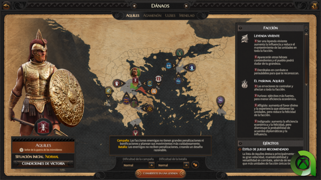 Antes de comenzar nuestra campaña, tendremos que elegir una facción que vendrá liderada por un personaje mítico. Cada una de las facciones viene acompañada de una dificultad, para que el jugador pueda elegir el desafío que más le apetezca. Como es de esperar, cada facción cuenta con unos beneficios y unas desventajas. Aunque en esta nueva entrega, más que la facción en sí, lo que más va a impactar en la jugabilidad de este título será el héroe con el que comencemos.