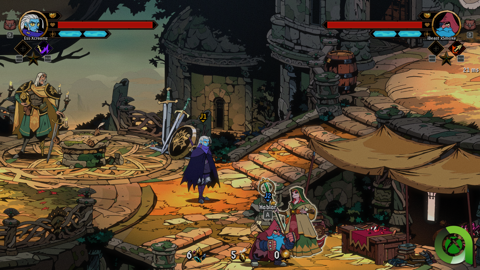 A pesar de todo esto, el juego tiene mucho más que ofrecer. Como digo, Absolum es un giro de tuerca de los títulos beat ‘em up clásicos. Durante nuestra aventura el juego mantiene la clásica estructura de un juego de scroll lateral, sin embargo, cada vez que terminemos una estancia tendremos un beneficio como en todo buen rogue lite, algo similar a lo que ocurre por ejemplo en Hades. Estas recompensas pueden variar entre oro, cristales o rituales. Estos últimos son los más interesantes, puesto que, nos ofrecen mejoras pasivas o activas para nuestro personaje. Cabe destacar que los rituales están ligados a una escuela de magia, que, previamente deberemos desbloquear liberando a los cristales mágicos del control de Azra.