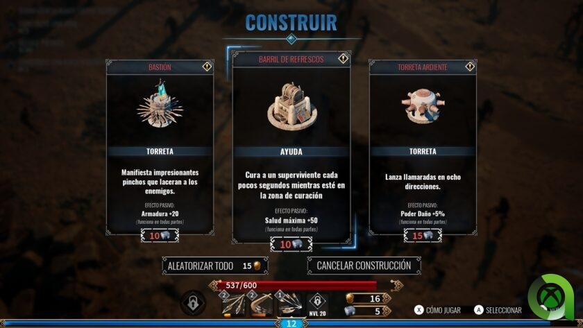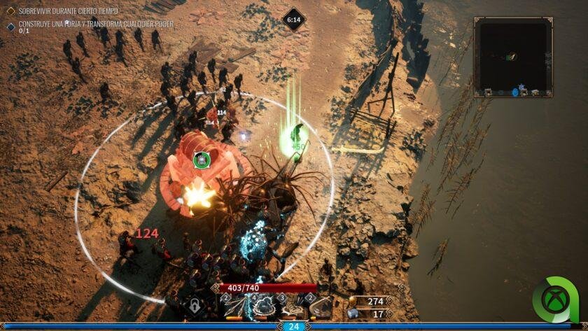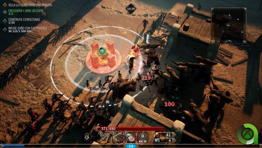 Aquí no deberemos únicamente sobrevivir. También será obligatorio completar algunos objetivos que se nos indicarán en cada misión antes de poder avanzar a la siguiente. Estos pueden implicar hacer una determinada cantidad de daño en la partida, abrir cofres repartidos por el mapa que además nos darán recompensas, o incluso construir estructuras. Porque sí, otra novedad que nos presenta esta propuesta es la posibilidad de construir estructuras, tras reunir materiales por el mapa o de enemigos, que nos pueden proteger de la invasión de estos. Torretas, guardianes centinelas, forjas para añadir ventajas adicionales a nuestros poderes… Todo ello ayudará a nuestro progreso durante los minutos que tengamos que sobrevivir.