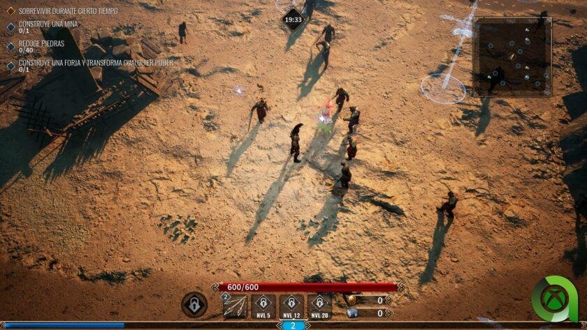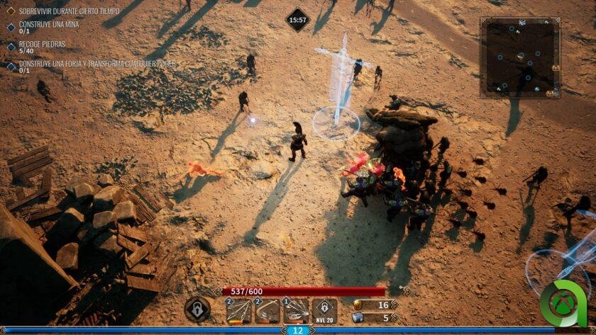Aquí no deberemos únicamente sobrevivir. También será obligatorio completar algunos objetivos que se nos indicarán en cada misión antes de poder avanzar a la siguiente. Estos pueden implicar hacer una determinada cantidad de daño en la partida, abrir cofres repartidos por el mapa que además nos darán recompensas, o incluso construir estructuras. Porque sí, otra novedad que nos presenta esta propuesta es la posibilidad de construir estructuras, tras reunir materiales por el mapa o de enemigos, que nos pueden proteger de la invasión de estos. Torretas, guardianes centinelas, forjas para añadir ventajas adicionales a nuestros poderes… Todo ello ayudará a nuestro progreso durante los minutos que tengamos que sobrevivir.