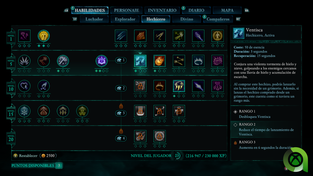 Por otro lado, tenemos la opción de utilizar la magia. Esta, tendrá un pequeño atajo mediante los grimorios (cada uno cuenta con 4 hechizos). Sino, siempre podremos recurrir al árbol de habilidades para desbloquear los poderes. Además, existen otros poderes que iremos desbloqueando (o no) a medida que avancemos en la aventura principal. Tendremos hechizos de los elementos más comunes como son: fuego, hielo, electricidad, veneno. Podremos desbloquear otros a parte de realizar invocaciones. Este árbol de habilidades se divide en 3, desbloqueando otras habilidades pasivas o activas que no necesariamente tienen que ver con la magia, como un grito atemorizante o una carga.