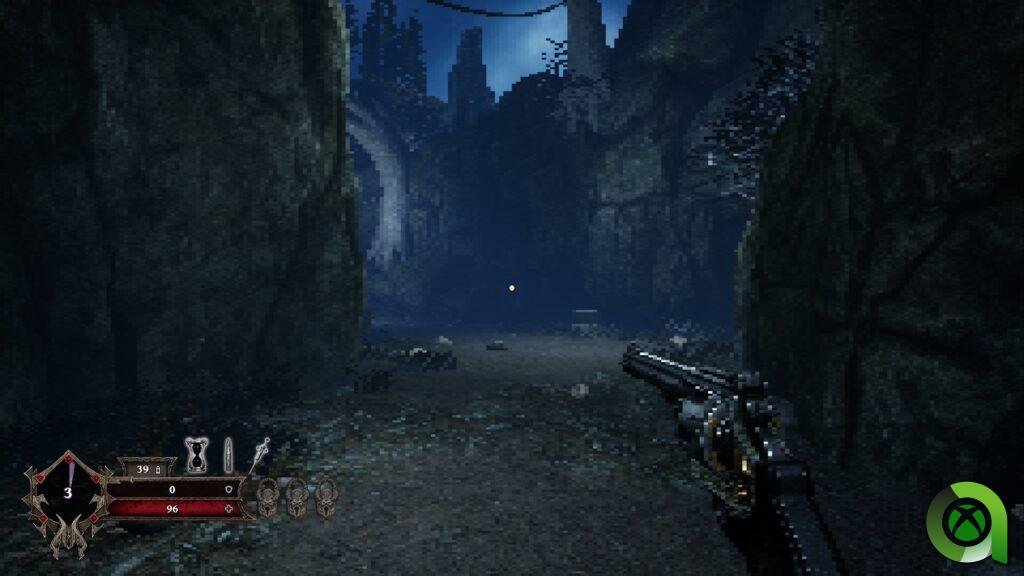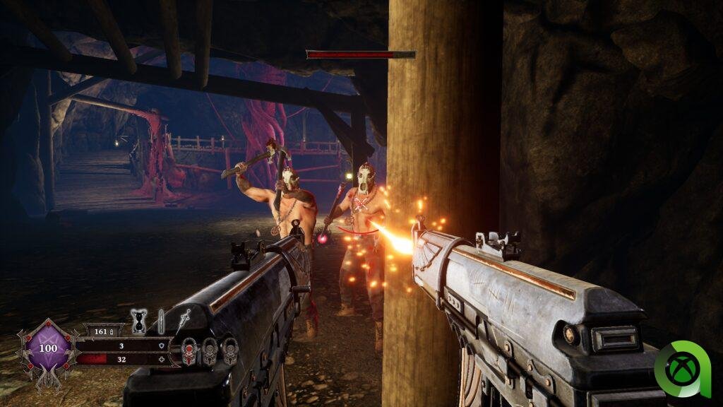 Comenzamos con una simple daga y un revólver, arsenal que iremos aumentando progresivamente con escopetas, ballesta, fusil de asalto… Y prácticamente cada arma tiene su propio disparo secundario al pulsar el botón LT. Por ejemplo, al pulsar este botón con el fusil de asalto equipado, este pasará a estar en ambas manos del protagonista. Si lo hacemos con la escopeta de corredera, golpearemos con su culata. También podemos saltar (más para esquivar ataques enemigos que para plataformeo) y usar habilidades especiales como ralentizar el tiempo o aumentar nuestro daño infligido temporalmente. Esto último se recarga mediante la recogida de unos orbes mágicos que sueltan los monstruos al morir.