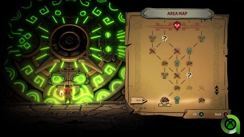 Podremos elegir entre 3 caminos diferentes para completar las mazmorras, uno por cada templo. Y dentro de cada templo podemos escoger qué ruta seguir según la recompensa que contenga, ya sea oro, nuevas armas, favores divinos o reponer la salud. Estos caminos se generarán aleatoriamente, por lo que cada incursión será diferente. Al superar los tres primeros templos tendremos las llaves suficientes para pasar al siguiente nivel, donde se nos vuelven a presentar los tres mismos templos pero con unos recorridos más complicados, más largos y con más enemigos. Además, en el nivel dos tendremos que volver a derrotar al jefe que ya vencimos en el nivel uno antes de enfrentarnos al verdadero jefe del nivel dos.