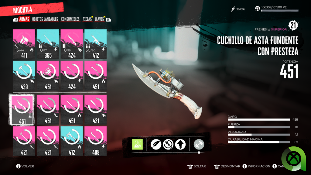 Una cosa curiosa que no sé si acaba de gustarme es la subida artificial del nivel del arma. En los bancos de trabajo también podremos equiparar el nivel de las armas simplemente pagando un precio. Es decir, si al principio de la partida hemos conseguido un machete electrocutador que nos encanta pero conforme hemos ido subiendo de nivel notamos que ha quedado desfasado en las mesas de trabajo podremos subirlo de nivel. Con solo dejar pulsado un botón ese arma adquirirá el nivel del arma más fuerte que tengamos en nuestro arsenal. Entiendo que es una fórmula para no calentarse mucho la cabeza y que no te distraigas de lo que realmente importa, que es la muerte y destrucción de los zombies. Sin embargo, esto puede causar un desajuste en el nivel de dificultad del juego y puede volvernos muy poderosos en un momento temprano de nuestra aventura. Esto, además, se acrecenta cuando consigues las armas de fuego y el plano para crear su munición y modificaciones. En este instante, es posible que tu personaje se convierta de la noche a la mañana en un semi dios matazombis.