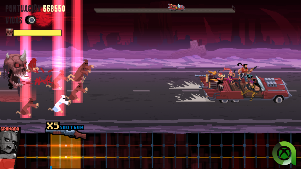 Las estéticas de juego son del estilo de 16 bits. Me parece acertado sobre todo para el público al que desean llegar. El diseño de los enemigos, armas, vehiculó y personajes es muy bueno. Logran dar el feeling de un comic, recordándome un poco a los gráficos vistos en el juego arcade de Scott Pilgrim Vs The World del Xbox 360. Al ser un juego rítmico, el apartado de Sonido es en el que más se destaca. Las canciones elegidas por el equipo son muy buenas y requerirán de que puedas seguir el ritmo.