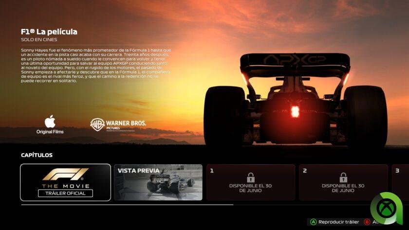Con motivo del estreno a finales de junio de F1: The Movie, contamos con un modo de juego por capítulos con escenas de la película en la que reviviremos ciertos momentos de la misma. Por desgracia, sólo está disponible el primer capítulo del juego. A partir del estreno de la película, estarán disponibles los demás. Además, por completarlos obtendremos elementos cosméticos de la cinta protagonizada por Brad Pitt que podremos equiparle a nuestro avatar en el juego.