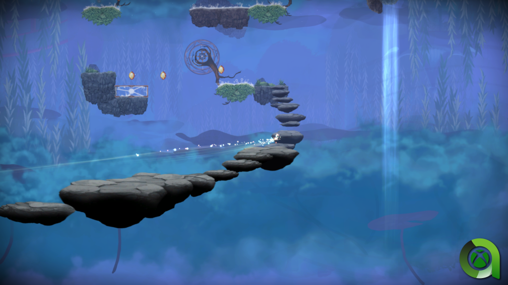 Llegado este momento toca ser muy duro con el juego. Hasta cierto punto, podría decir que Evergate es el Dark Souls de los plataformeros indies. O tal vez sea algo exagerado, puesto que la dificultad del juego no es tan alta de principio a fin. Comienza de forma sencilla, enseñándonos los controles y mecánicas de las que disponemos, principalmente la Ignealma. La Ignealma nos permite romper cristales, con los cuales obtenemos impulso y nos movemos por el nivel. Estos también nos permiten romper barreras para avanzar hasta la línea de meta.