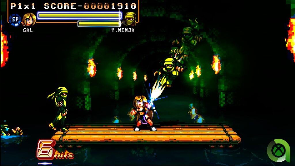 Fight’N Rage no es la panacea audiovisual de los videojuegos pero tampoco pretende serlo. No obstante, tiene un apartado artístico destacable gracias a un detalladisimo estilo pixel art que, como hemos comentado anteriormente, no afecta por igual a personajes y escenarios. Ni siquiera está al mismo nivel el detalle de los protagonistas, cuyo aspecto visual y movimiento es exquisito, que el de los enemigos, que es algo más flojo. El movimiento es muy fluido y los 60 fps de la Xbox Series X le sientan de maravilla a un título que se mueve rápido como el rayo. Por lo general, es un juego algo oscuro pero hay algunos efectos gráficos que son muy resultones. Además, existe la posibilidad de utilizar varios filtros para la imagen que nos permitirán simular las antiguas teles de tubo o disfrutar de una mayor nitidez de los píxeles, acorde a los tiempos que corren actualmente.