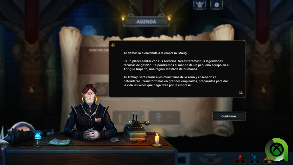 Dicho esto, tenemos que tener en cuenta, que el juego no sólo es pura gestión de recursos, sino que cuenta con muchos elementos de juegos roguelike. Es por ello, que muchas acciones dependerán tanto de la suerte como de nuestras decisiones. La estructura del juego siempre será la siguiente; tendremos varias semanas antes de que un grupo de aventureros intente acabar con nosotros. Durante este tiempo, podremos elegir varias acciones, como la mencionada contratación de personal, entrenamientos, saqueos, terapia etc. Estos eventos son totalmente aleatorios, por lo que cada partida será única.