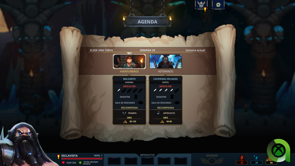 Dicho esto, tenemos que tener en cuenta, que el juego no sólo es pura gestión de recursos, sino que cuenta con muchos elementos de juegos roguelike. Es por ello, que muchas acciones dependerán tanto de la suerte como de nuestras decisiones. La estructura del juego siempre será la siguiente; tendremos varias semanas antes de que un grupo de aventureros intente acabar con nosotros. Durante este tiempo, podremos elegir varias acciones, como la mencionada contratación de personal, entrenamientos, saqueos, terapia etc. Estos eventos son totalmente aleatorios, por lo que cada partida será única.
