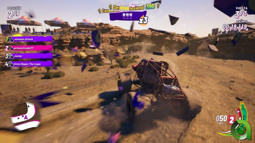 En cuanto a este aspecto cabe destacar que Monster Jam Showdown tiene a su disposición todo un tutorial dedicado a los nuevos jugadores, así como varios ajustes de dificultad para que no se le atragante a nadie. También podemos revisar las repeticiones completas de nuestras carreras, pudiendo así revisar en qué hemos fallado, por ejemplo. Todo esto es algo muy de agradecer, teniendo en cuenta que no estamos ante un tipo de automóviles que estemos muy acostumbrados a pilotar en videojuegos.