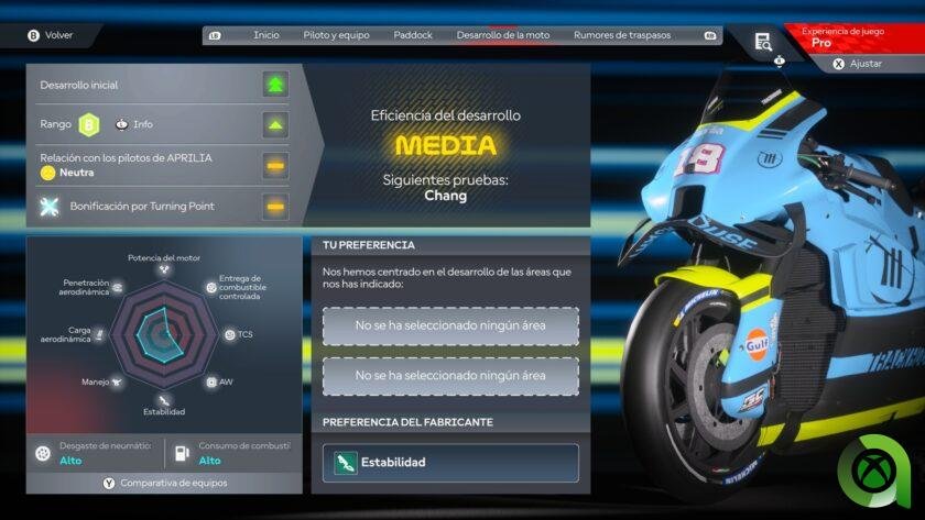 Una vez empezamos nuestro camino en el motociclismo, contamos con diferentes menús como el desarrollo de la moto, mercado de pilotos, etc. En la ventana de desarrollo de la moto veremos desglosadas diferentes áreas de la moto que podemos desarrollar. Al final de cada fin de semana de carrera tendremos una charla con nuestro ingeniero en la que decidiremos las siguientes áreas de desarrollo. Estas áreas podremos probarlas en los dos test que hay a lo largo de la temporada y decidir cuáles incorporamos a la moto. Además, podremos comparar el desarrollo de nuestra moto con la de nuestros rivales directos. Con esto podremos mejorar nuestra moto de manera más óptima.