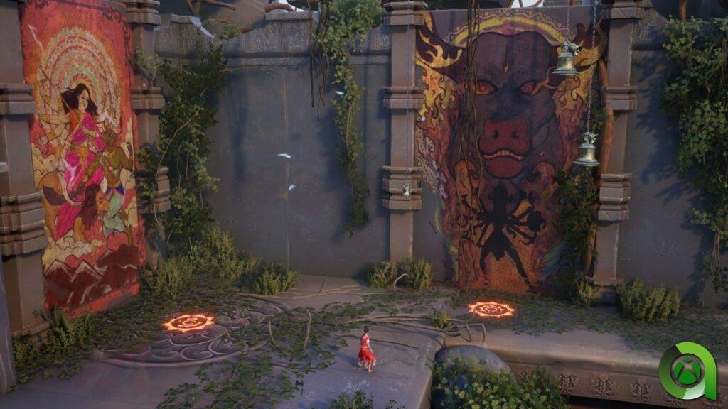Una cosa curiosa del título es que la cámara (que no podemos manejar libremente) está más alejada de lo normal. En ocasiones funciona bien para dar magnitud a la escena o para hacerte una idea general de por donde discurre el escenario. Por ejemplo, encontraremos inmensos murales de pinturas Pahari donde nos van narrando las historias de los diferentes dioses. Pero otras veces te preguntas: ¿por qué estoy tan lejos de la acción? De esta manera parece que pierdes inmersión y te aleja espiritualmente de la protagonista, haciendo que no te sientas tan identificado con ella.