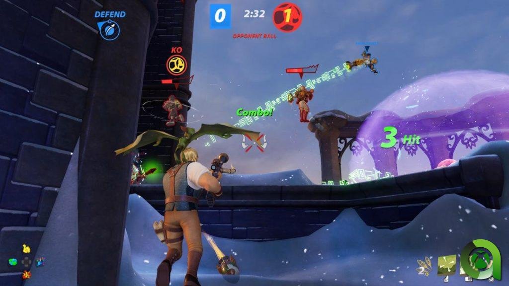 Durante el combate los personajes tienen una barra de energía que al ser golpeado se va llenando. Al llegar a límite esta brilla y es cuando te pueden dar un tiro de gracia que te saca de la arena. De ahí la comparación con Smash Bros. Dentro de Rocket Arena encontrarás varios modos de juego. RocketBall, consiste en una pelota que hay que llevar a la base enemiga para detonarla. Pepinazo es un modo de control de territorio, donde el territorio es un cohete de tamaño descomunal. Caza del tesoro, combina la captura de objetivo (cofre de monedas) con el uso de la movilidad de personajes para recolectar monedas. Y finalmente el modo central a mí parecer Acoso y derribo. Este consiste en sacar a un número definido de oponentes de la Arena. Todos estos modos se juegan en formato de 3 contra 3.