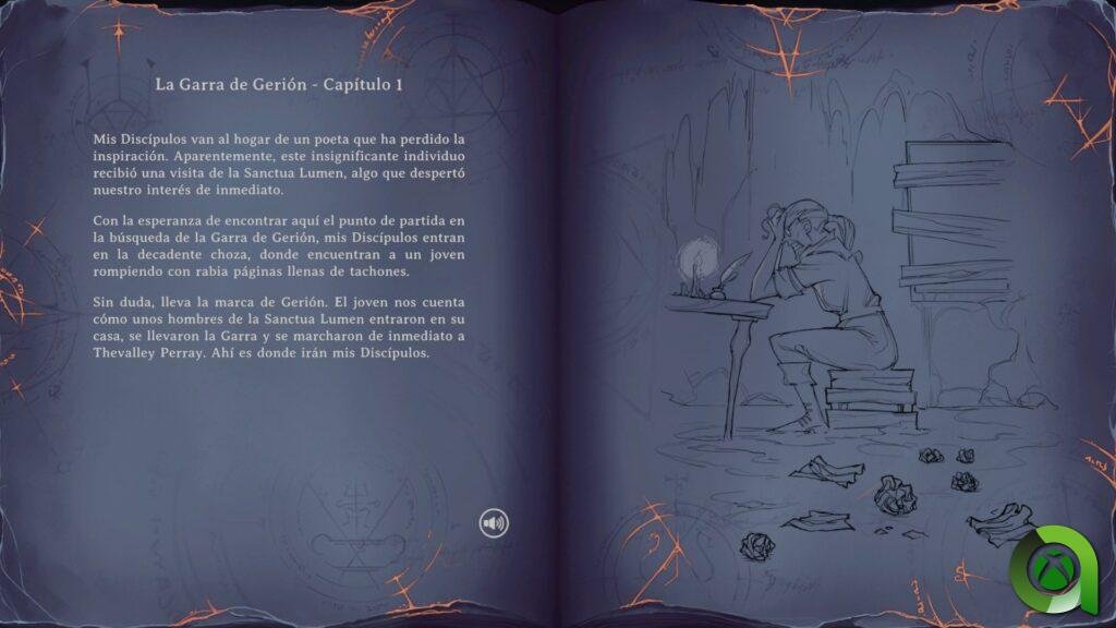 Una de las características que más me ha llamado la atención del título es el impacto o la presencia que tiene la narrativa durante toda la aventura. Las partidas se dividen el libros, por lo que cada vez que seleccionemos uno se nos narrará una breve historia a través de una cinemática. A medida que avancemos en el libro sucederán diferentes eventos en relación a ésta e iremos adentrándonos más y más en su mundo.