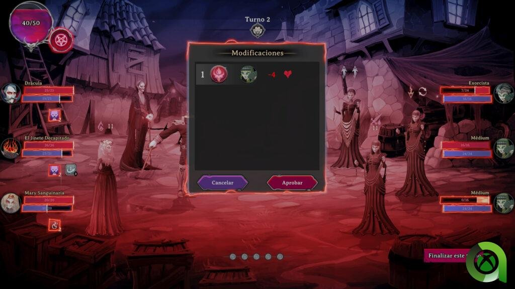 Asimismo, al poco que juegues un par de combates verás que cada uno de estos personajes tiene unas habilidades propias orientadas a una funcionalidad dentro del combate. Es decir, como una especie de clases, así pues, Drácula sería un personaje de apoyo, mientras que el Jinete sin Cabeza sería un personaje mucho más agresivo.