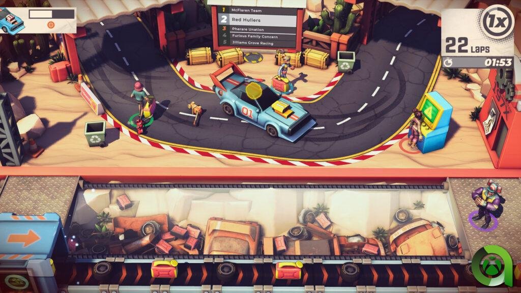 Sin embargo, ese es simplemente el trasfondo, pues este juego es, en realidad, la versión de los pitstops de Overcooked. Es decir, tendremos que cambiar ruedas y arreglar los vehículos que nos lleguen en el menor tiempo posible para ganar las carreras. Todo ello lo haremos, claro, en un divertidísimo caos y con mapas cada vez más extravagantes. Y es que, pasaremos desde la calle misma hasta una zona de cintas transportadoras o agujeros en el suelo llenos de lava.