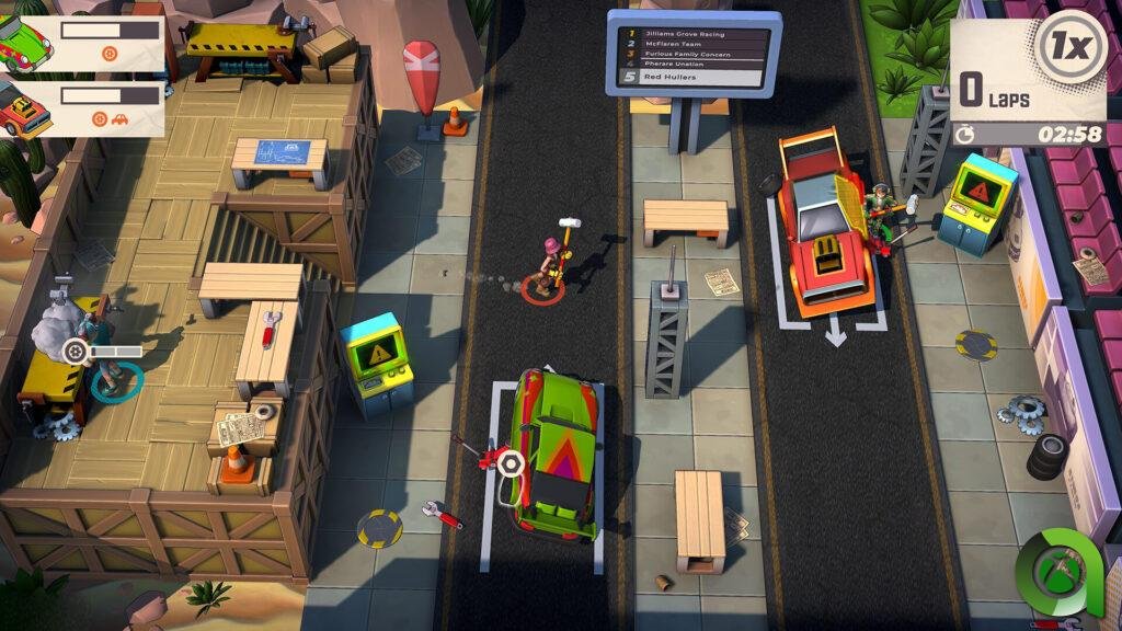 Sin embargo, ese es simplemente el trasfondo, pues este juego es, en realidad, la versión de los pitstops de Overcooked. Es decir, tendremos que cambiar ruedas y arreglar los vehículos que nos lleguen en el menor tiempo posible para ganar las carreras. Todo ello lo haremos, claro, en un divertidísimo caos y con mapas cada vez más extravagantes. Y es que, pasaremos desde la calle misma hasta una zona de cintas transportadoras o agujeros en el suelo llenos de lava.