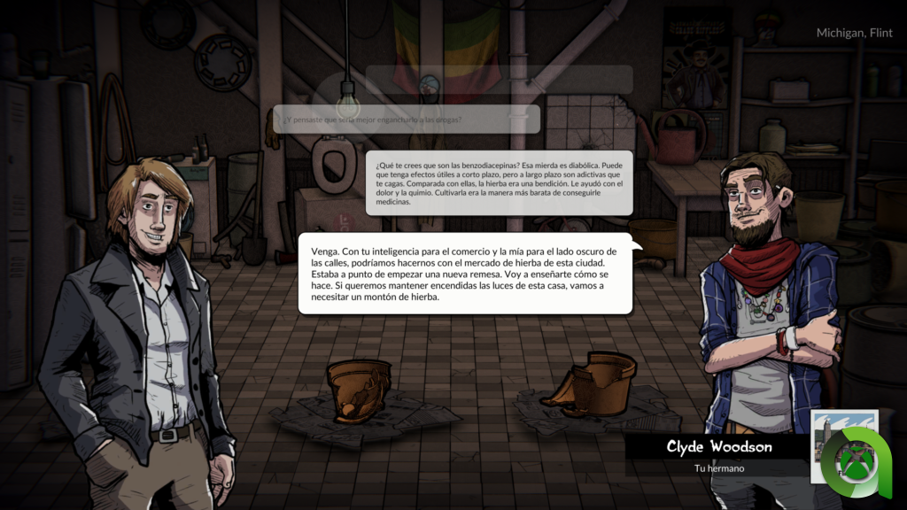En la primera, dos hermanos, uno universitario con poco futuro y otro fumeta con una extraña visión de negocio, se dedican a vender hierba después del fallecimiento de su padre. Es el mejor modo de empezar esta aventura ya que esta historia es en parte el tutorial del juego. A pesar de esto, el título no te enseña ni el 10% de las complejidades que esconde, por lo que muchos jugadores que no sean especialmente resueltos con este tipo de juegos van a sentir una ligera frustración en sus inicios.