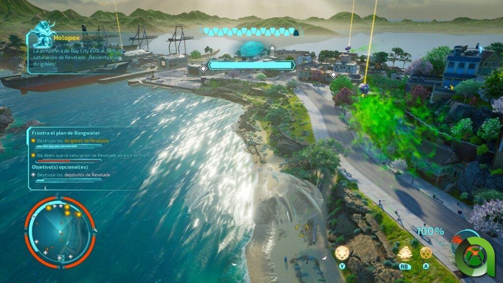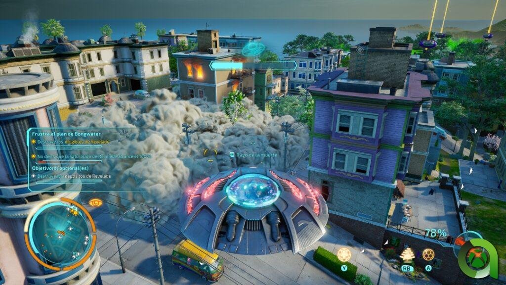 Y por si fuera poco, el rayo destructor de nuestro platillo hará venirse abajo cualquier edificio. Un efecto que queda genial, y que anima a destruir todo cuanto encontremos a nuestro paso. Y si nos atacan con misiles, siempre podremos evitarlos con una onda que los repele. Eso sí, al igual que cuando vamos a pie, habrá que vigilar el escudo protector, puesto que no es infinito.