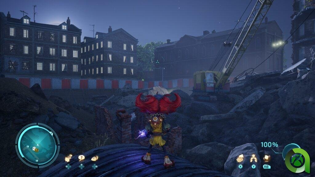 El desplazamiento es mucho más ágil gracias al platillo volante, pero sobre todo y ante todo, a la función de las botas aerodeslizadoras de Crypto. De esta forma, manteniendo pulsado «B» se activarán y nos moveremos mucho más rápido por el escenario. A ello hay que sumar las posibilidades que se abren al poder impulsarnos por el aire, pudiendo acceder a las zonas más elevadas.