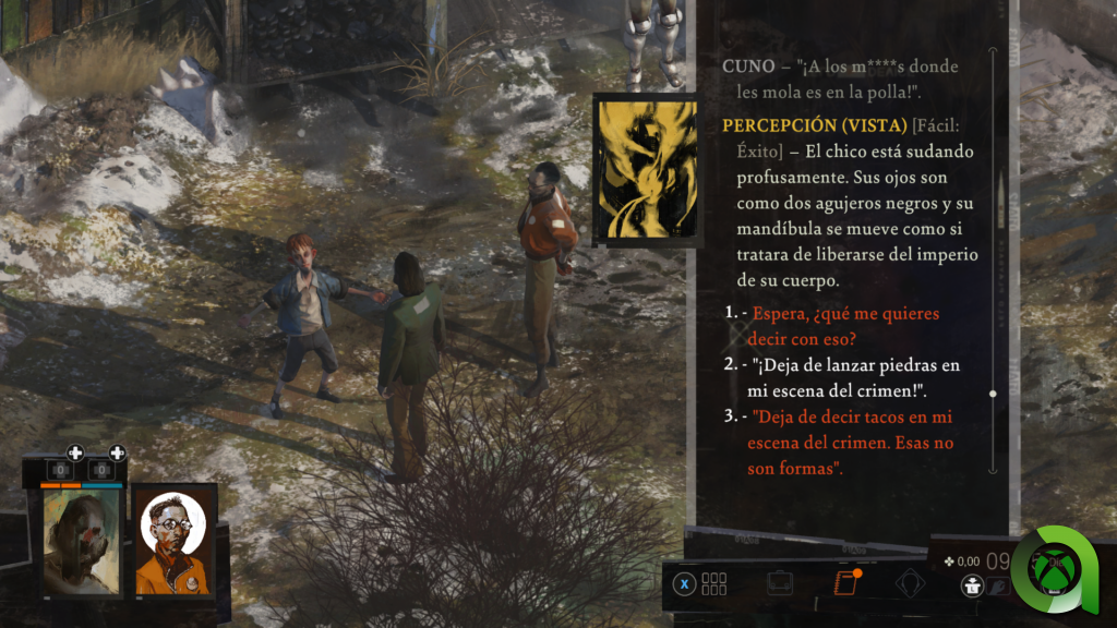 En Disco Elysium se tratan temas de todo tipo. Decía anteriormente que sus diálogos emplean un lenguaje más bien peculiar, que requiere de cierta comprensión. Y es que de esta forma se abarcan multitud de temas, siendo un título que no se corta lo más mínimo a la hora de tratar temas políticos, económicos o sexuales, asesinatos… y escogiendo en muchas ocasiones palabras malsonantes. Se agradece este planteamiento, más aún viniendo de un videojuego indie.