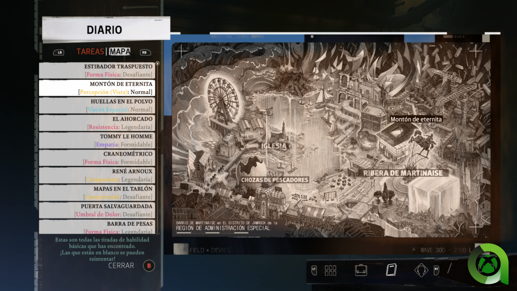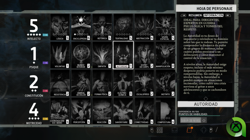 Por su parte, la profundidad jugable invita a indagar en las habilidades del protagonista, a través de un menú denominado «Hoja de personaje». En él, encontramos cuatro apartados; intelecto, psique, constitución y motricidad. Dentro de cada uno, tendremos sus características asociadas, como teatralidad, resistencia, conectividad, lógica, y un largo etc. Estas características pueden mejorarse, pero habrá que hacerlo según el arquetipo que hayamos escogido en un principio. Si bien podemos personalizarlo al gusto, el juego ofrece tres arquetipos; intelectual (el que yo escogí), emocional o bruto.