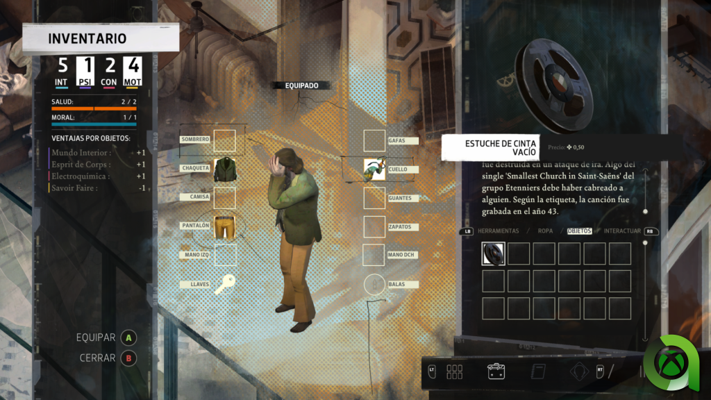 Los objetos del inventario también tienen una gran relevancia. En nuestro equipo, veremos en todo momento lo que llevemos equipado, así como los menús del inventario, repartidos en ropa, herramientas, objetos e interactuar. Este último, presenta los objetos que hayamos descubierto y que permiten interactuar con los mismos para obtener nueva información. En cuanto a ropa y herramientas, debemos gestionar la presencia de nuestro agente, y también equiparle con lo necesario. Un claro ejemplo de ello, es que las herramientas nos serán muy útiles para acceder a ciertos lugares o abrir ciertos compartimentos.