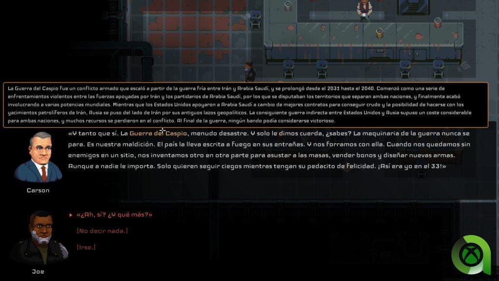 Con estas bases, ya podemos ver que la trama, derrochando solidez y complejidad, será una de sus apuestas. El propio juego se encarga de profundizar en los hechos que salen a colación en los diálogos. Bastará con hacer click encima de los textos subrayados en amarillo para que se nos informe de dicho acontecimiento histórico, empresa, persona…