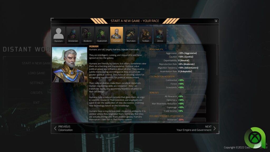 Una vez demos comienzo a nuestra odisea espacial, el juego pondrá a nuestra disposición una gran cantidad de opciones para empezar la partida. Como la forma, tamaño y número de estrellas que tendrá nuestra galaxia. El nivel tecnológico en el que empezamos, dificultad, etcétera. Podremos elegir entre 7 civilizaciones distintas, cada una de ellas tiene sus propias bonificaciones y sus propias contras. Como bonus a la diplomacia o una penalización al comercio con otras razas por ejemplo. Después de saber la civilización que lideraremos, elegiremos tanto el nombre, como la bandera y una de las opciones más determinantes de nuestra partida: el sistema de organización política. Ya que marcará el curso de nuestro pueblo. Estando disponible desde una dictadura militar hasta una república. Al igual que con las civilizaciones, tienen sus bonus y contras propios. Por lo que deberemos tenerlo seriamente en cuenta a la hora de empezar nuestra partida.