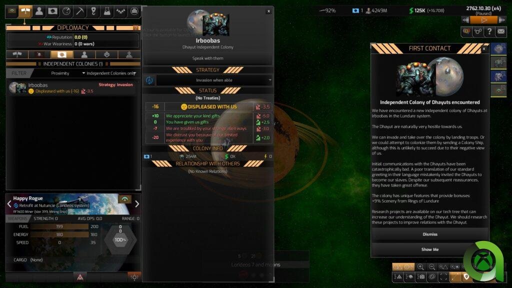 La gran esencia del juego una vez estamos adaptados, son los pilares de la exploración, diplomacia y colonización. Por suerte, la exploración estelar y planetaria está automatizada por defecto. Cada vez que descubramos minerales o restos interesantes en planetas previamente avistados, seremos notificados. Seguido de esto, el juego nos preguntará si queremos explotar los recursos de ese planeta construyendo una estación espacial en órbita. La minería es importante en el juego, ya que nos permitirá ganar más créditos con los que sostener nuestra economía y seguir expandiendo nuestra flota y nuestras fronteras a partes iguales. Como mencionaba anteriormente, a la vez que expandamos fronteras, nos toparemos con otras civilizaciones con las que entraremos en contacto. Aquí la diplomacia no tiene mucho misterio. Estarán disponibles las clásicas opciones presentes en todo juego de estrategia. Como es el comercio, pactos defensivos, etcétera.