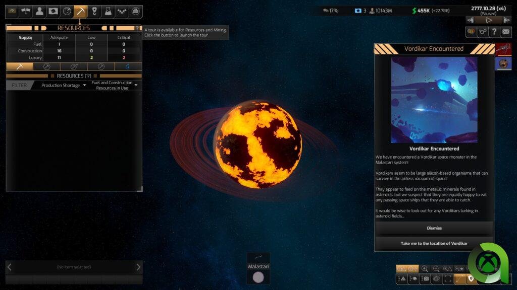 Como ya os comentamos en nuestras primeras impresiones, durante los primeros compases del juego nos explicarán lo básico para que empecemos a jugar con fluidez. Explicándonos el funcionamiento básico del juego, como el árbol tecnológico, diplomacia, construcción de astilleros, etc. Por suerte, me he encontrado que gran parte de las mecánicas del juego como a exploración espacial o la minería de algunos planetas está automatizada, facilitando la adaptación al juego.