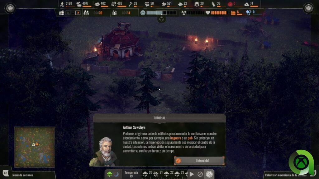 No solo es ágil en sus menús, o en la interacción con el entorno y las edificaciones del asentamiento, sino que también cuenta con un modo de juego denominado «Tutorial». Pero no confundáis este modo con lo que pudiera ser un simple tutorial en otros videojuegos; aquí tenéis una aventura completa de la que disfrutar si sois primerizos en Endzone, con objetivos ya de por si fijados. Además, las ventanas de texto de nuestro buen amigo Arthur Sawchyn estarán presentes en todo momento para indicarnos cual es el siguiente paso.