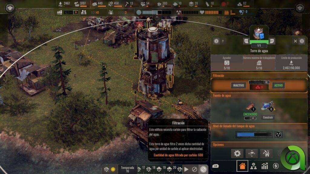 En cuanto a la construcción, es cierto que el juego basa (en parte) su crecimiento en la lógica de apostar desde un principio por los recursos más básicos. Comida, agua, un techo bajo el que dormir… hasta ahí cualquiera entendería rápidamente las necesidades de los colonos. Pero la jugabilidad no tarda en volverse mucho más profunda, y es que la radiación o el clima desfavorable nos obligarán a emplear otras soluciones, como por ejemplo filtrar el agua de lluvia, construir un pozo en una zona estratégica con vistas a la sequía, o construir un centro médico para tratar a los colonos enfermos.