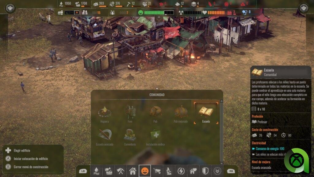 El carácter «city builder» de este juego no es meramente simbólico por la apariencia del refugio que estamos construyendo, es que realmente debemos crecer y establecer una enorme colonia de supervivientes. Con el paso de las temporadas, uno se va dando cuenta de la envergadura de la situación. Realmente hay muchísimos edificios que construir en los menús por categorías, a lo que hay que sumar que estos también pueden mejorarse.