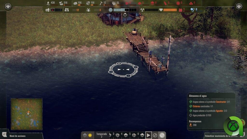 Si nos vamos a la parte superior de la pantalla, tendremos información completa acerca de nuestros recursos. Es decir, la cantidad de comida, chatarra y madera recolectada, agua… por lo que existe un control total de nuestros suministros, así como de nuestros colonos.