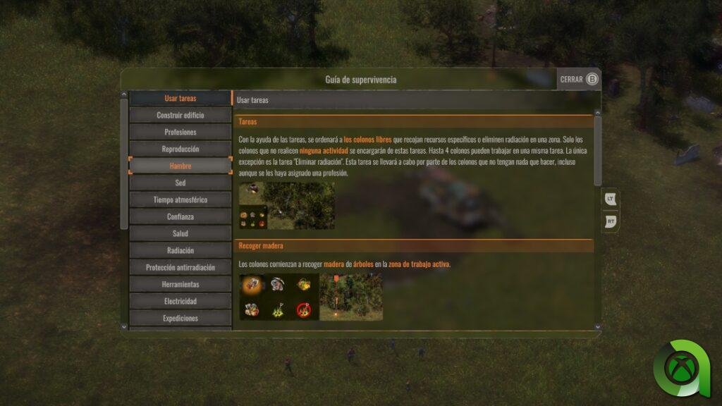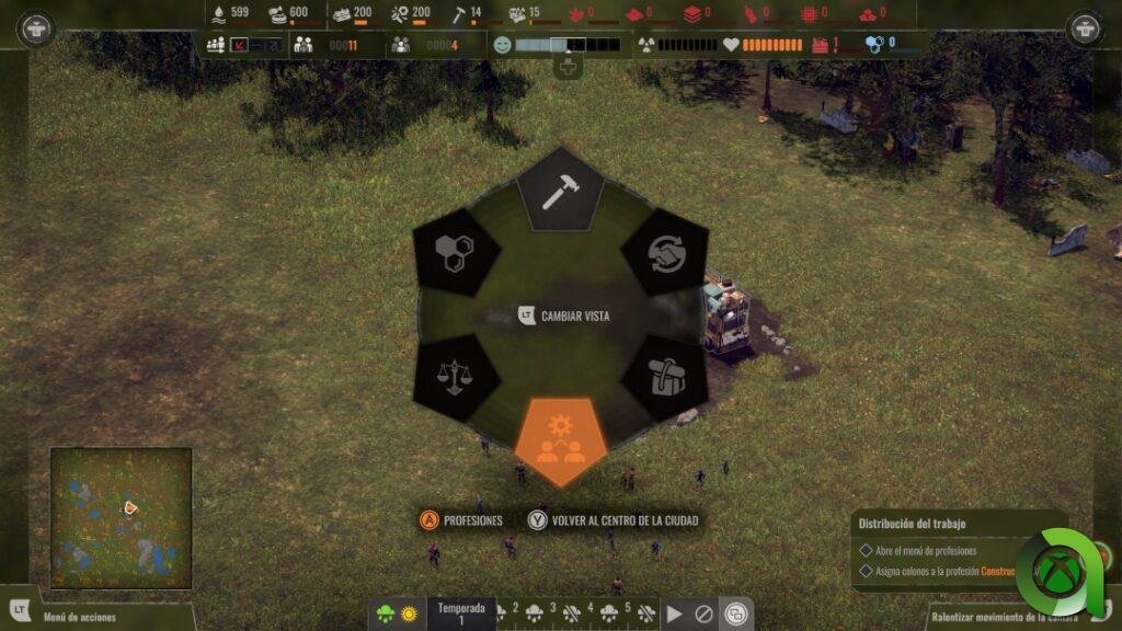 Este es uno de los menús más importantes del juego, y en el que pasaremos más tiempo a la hora de construir nuestro asentamiento. Con el tiempo, más que un refugio se convertirá en una verdadera ciudad, con edificios de todo tipo. Para ello, el menú radial cuenta con dos apartados vitales, el de las propias construcciones y el de las profesiones, los cuales nos llevarán a otros dos submenús.