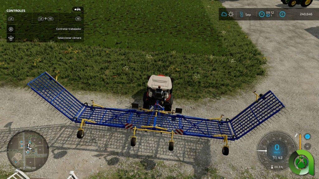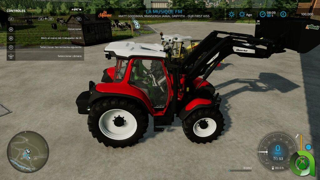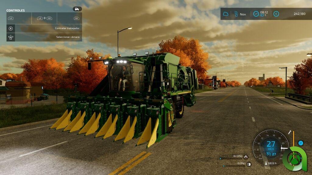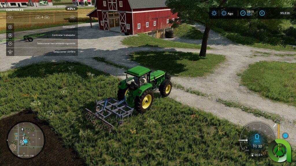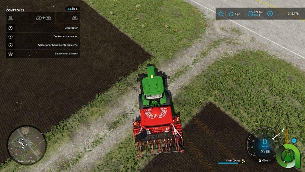 En cuanto a los controles, tenemos una buena adaptación al mando, con ciertos «comandos» usando los botones LB y RB, junto a los botones, con ellos, comandaremos el control del apero que llevemos en nuestro tractor, las luces o el control de crucero. En FS22, al menos por el momento, no están implementados sistemas GPS en los vehículos. Además, conforme acumulamos horas de trabajo en nuestros distintos vehículos y aperos, irán perdiendo rendimiento, que nos indica una barra junto al velocímetro. No os alarméis, podrá repararse en determinados puntos distribuidos por el mapa.