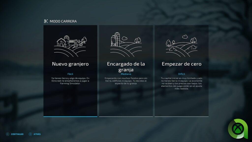 A la hora de empezar una nueva partida, se nos presentan 3 opciones que vienen a ser la dificultad de juego. En función de nuestro nivel de experiencia o el reto que querramos afrontar. Como recomendación personal, sugiero elegir la opción de «Nuevo Granjero», ya que nos facilitará más la curva de progresión. Una vez tengamos esto claro, tendremos la posibilidad de escoger 3 mapas distintos. Cada mapa está enfocado a una rama del sector primario, contando con uno que nos «obligará» a realizar las dos tareas si queremos sacar el mayor beneficio posible.