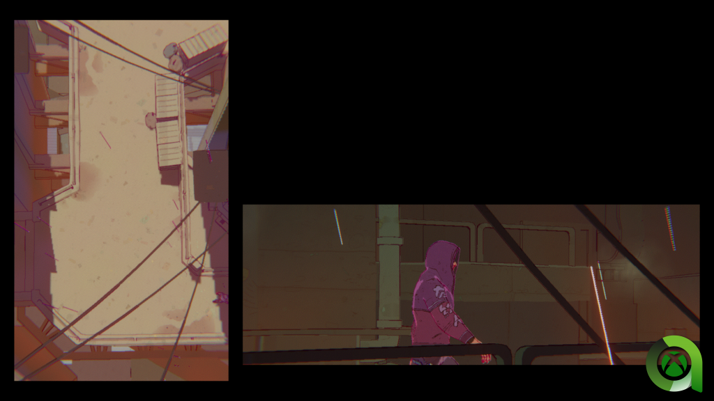 Las escenas de transición muestran, como os contaba antes, diferentes perspectivas con las que el juego va representando el camino de Evan. Por ejemplo, una primera ventana se abre a un lado de la pantalla, en la que llegamos a una especie de callejón elevado. La cámara nos enfoca desde el cielo, para posteriormente tras cruzar una puerta, cambiar a un plano lateral, y seguidamente volver al plano en tercera persona. Esta última es la cámara «principal» si lo queréis llamar así.