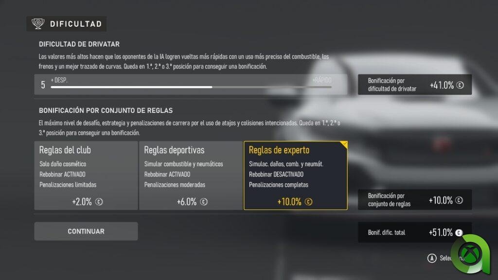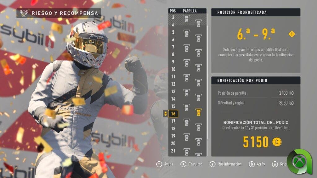 A la hora de correr contra la IA, Forza Motorsport nos permitirá escoger directamente la posición de salida. Puede que a algunos les choque, pero en estos casos no hay clasificación, ya que solo estará disponible en el multijugador. Eso sí, las recompensas en créditos y EXP serán mayores cuanto más alto sea el nivel de la IA y atrás salgamos en parrilla. Personalmente creo que no le vendría mal unas vueltas de qualy, aunque esto se comprende si atendemos a la problemática la IA.