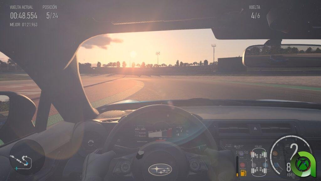 La iluminación es otra de las protagonistas. Turn 10 no deja nada al azar, y es que cada reflejo, cada sombra que veas, es porque realmente está ahí, e incide en el entorno. Este elemento me ha dejado fascinado, no imaginas cómo es correr en pleno atardecer, de noche o en pleno sol naciente hasta que estás ahí. La luz puede llegar a ser tan molesta en ciertos tramos del circuito, que condicione tu primera intención de dar gas. Esa misma luz se refleja también en los interiores de los vehículos, así como en el negro de la pista. Y como siempre, los vehículos pueden abrirse y apreciarse en todo su esplendor.