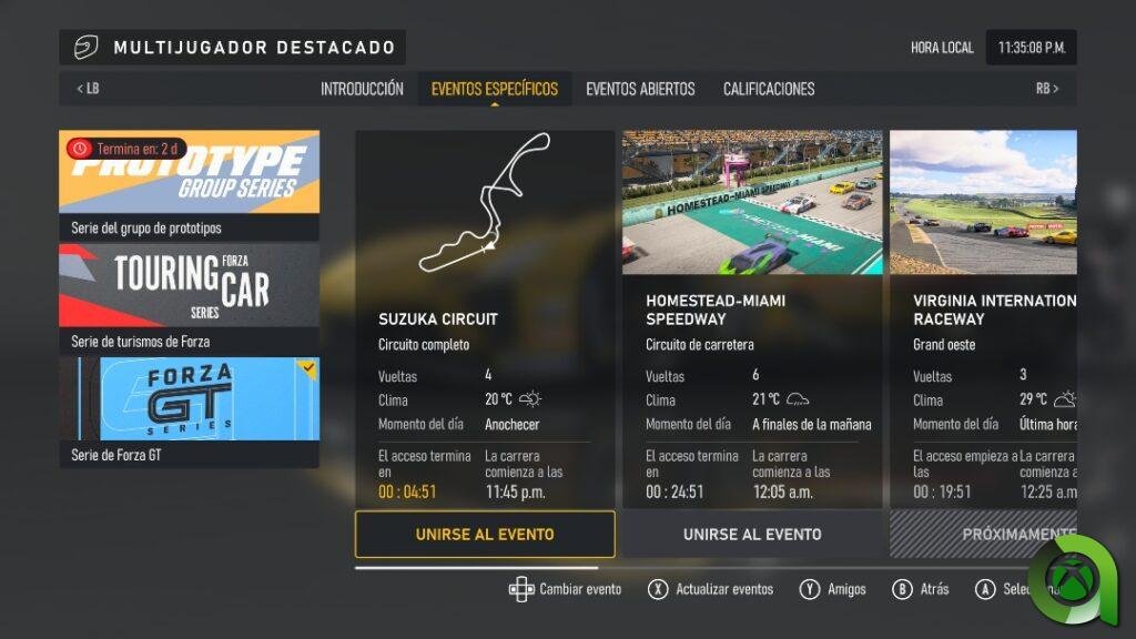 ¿Y cómo se accede a estos eventos multijugador? pues el menú es bastante sencillo e intuitivo. Al correr con el equipo de Turn 10, disfrutamos de tres modalidades diferentes. En primer lugar, participamos en rondas de clasificación, donde la clase y el tipo de vehículo se centraba en los turismos. Estas sesiones eran más cortas, con carreras de 3-4 vueltas. Posteriormente corrimos de nuevo con eventos de turismos al uso, con una mayor duración, diversos circuitos y un clima en ocasiones variable.